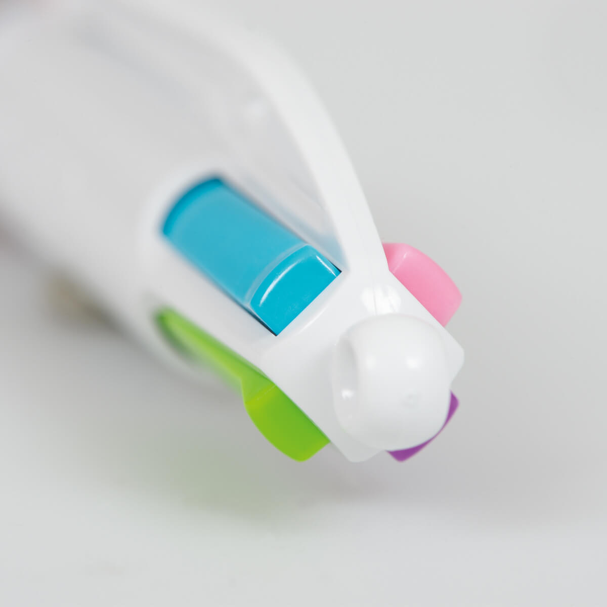 Der Farbwechsel wird durch Betätigen der farbigen Drücker ermöglicht, die Farbminen (türkis, pink, hellgrün, lila) sind langlebig und austauschbar.