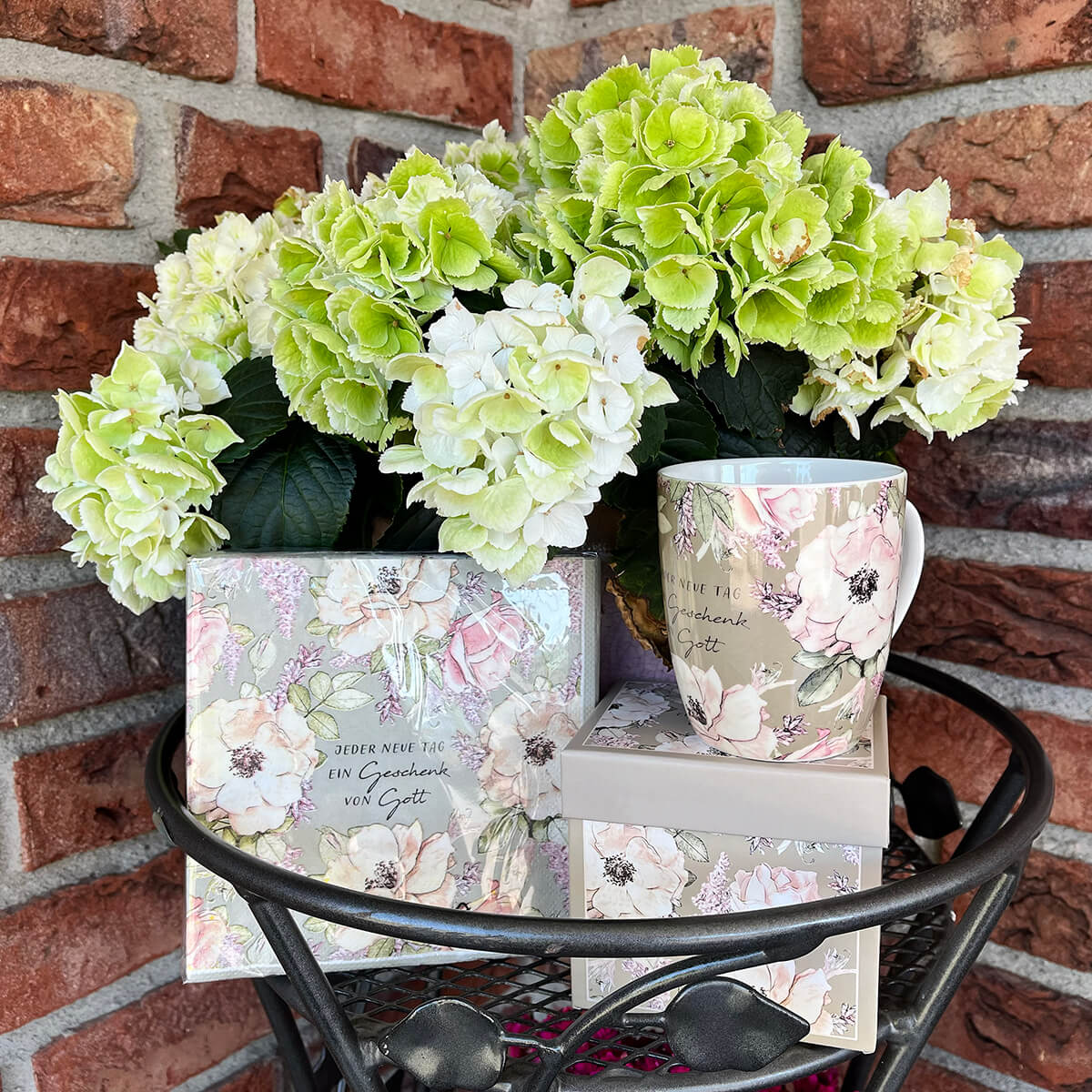 Servietten mit wunderschönem Blumen-Design und Text: "Jeder neue Tag ein Geschenk von Gott" runden einen gedeckten Tisch erst so richtig ab.