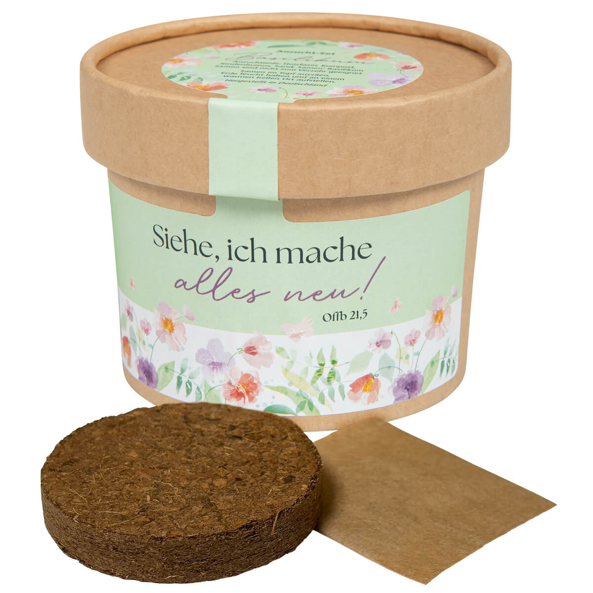 Selbst Kräuter züchten macht Spaß: Anzucht-Set für leckeren Basilikum in einem Pflanzbecher aus biologisch abbaubarer und ungebleichter Pappe. Schön gestaltetes Etikett mit der Jahreslosung 2026.
