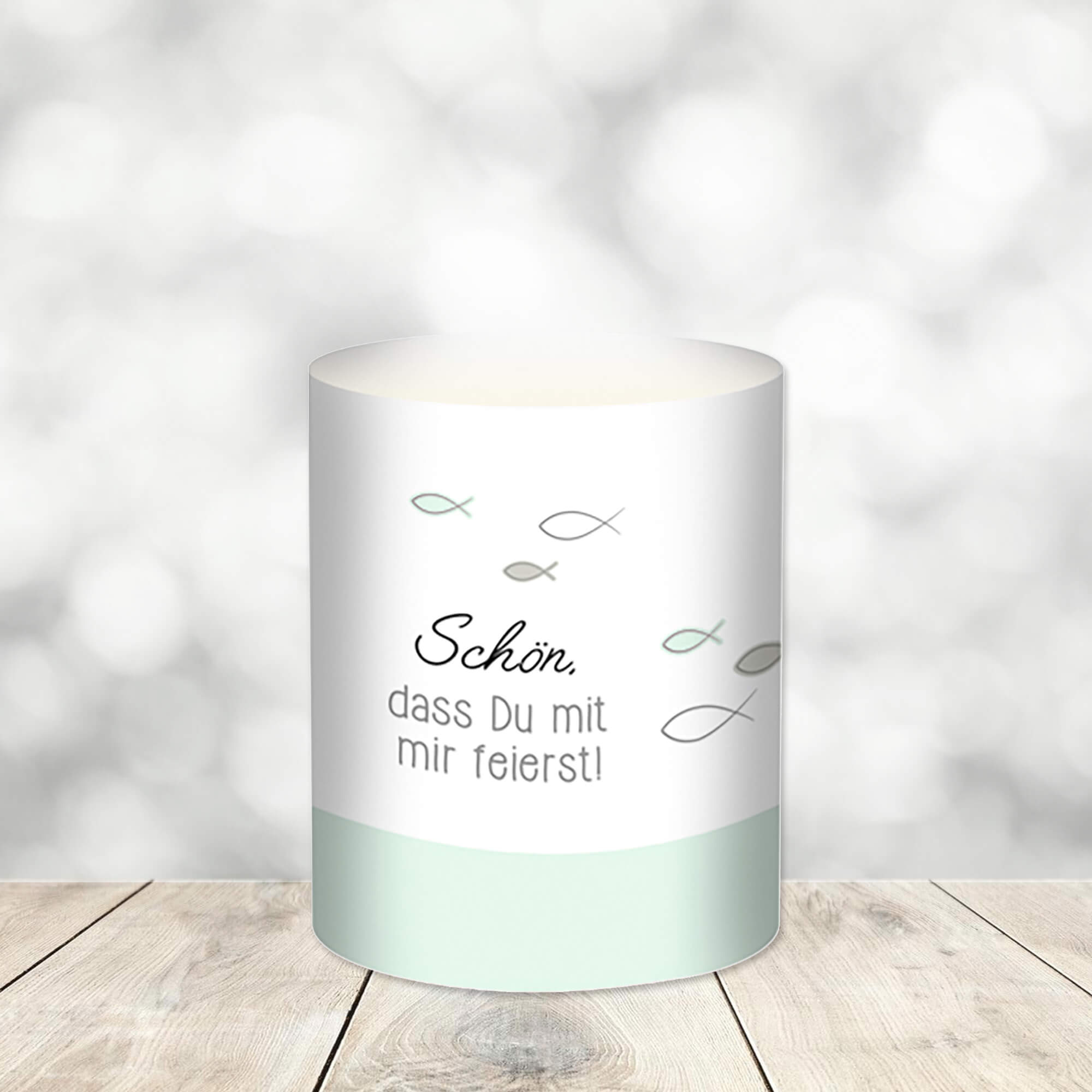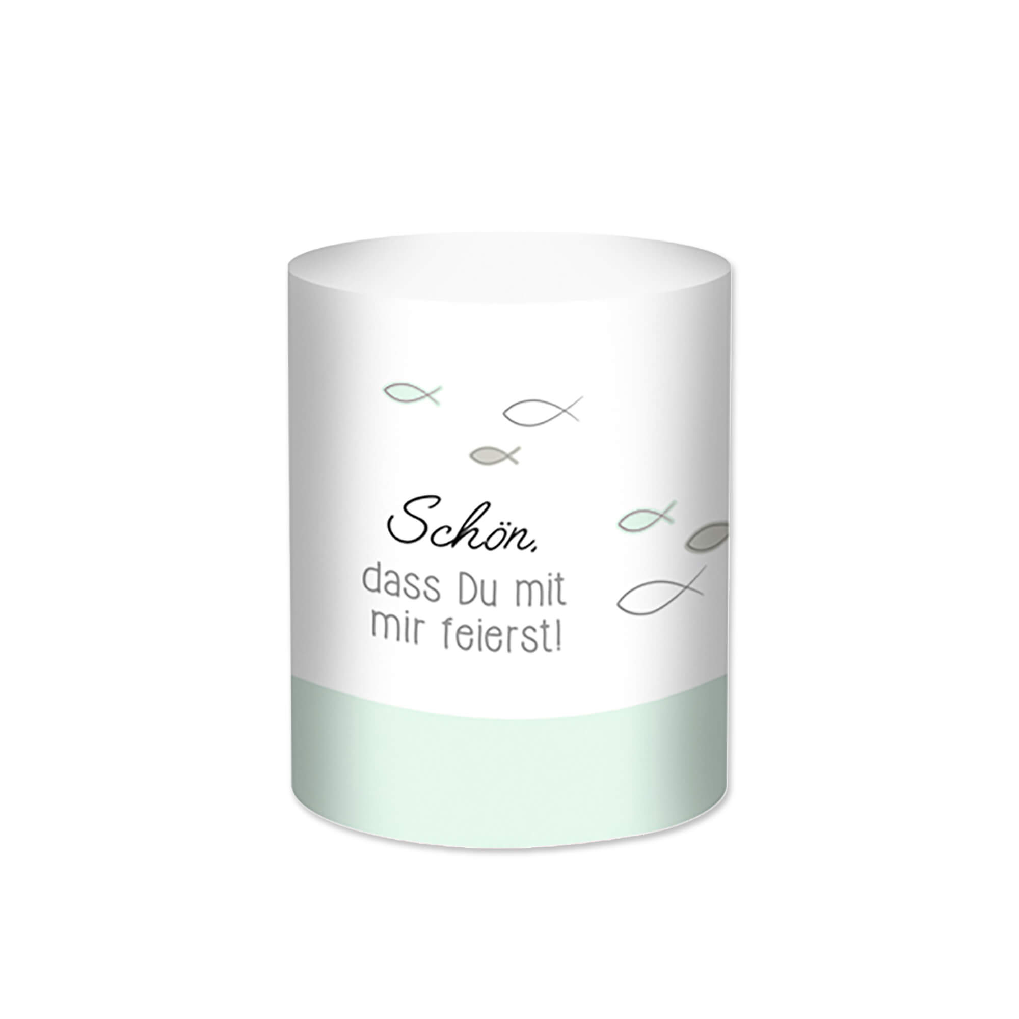 Das Set enthält 5 Blatt Transparentpapier, bedruckt mit Fisch-Symbolen und "Schön, dass Du mit mir feierst!"