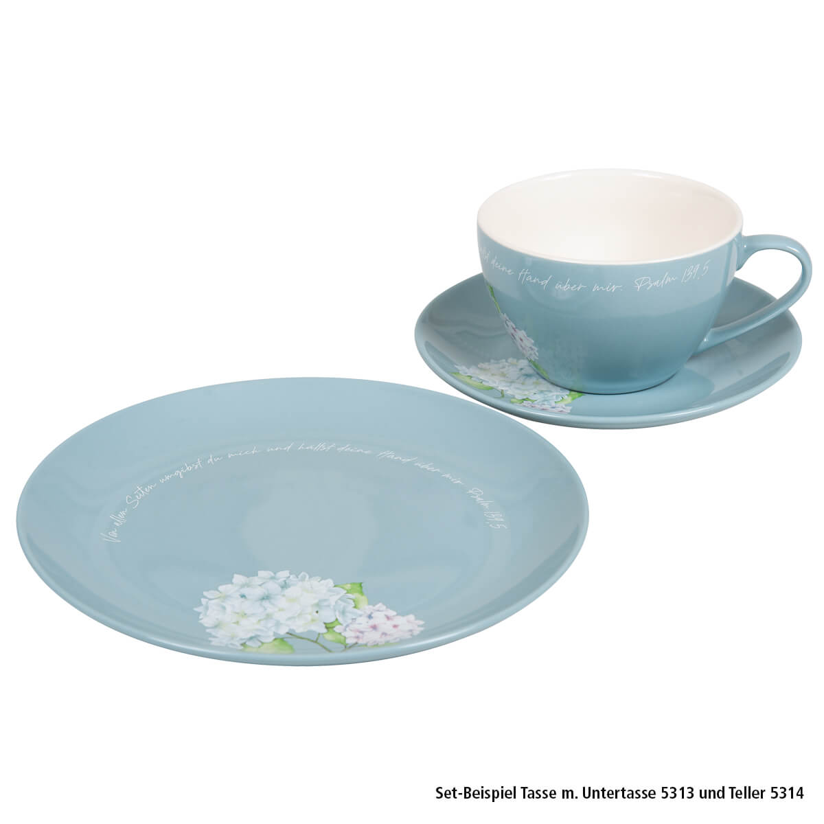 Der Vers "Von allen Seiten umgibst du mich" aus dem Psalm 139,5 ist auf dem oberen Tassenrand rundherum zu lesen.